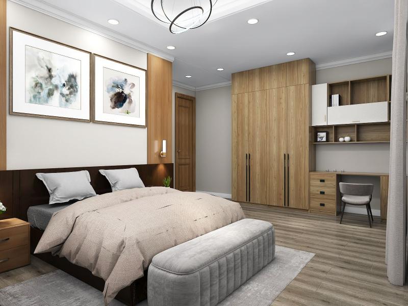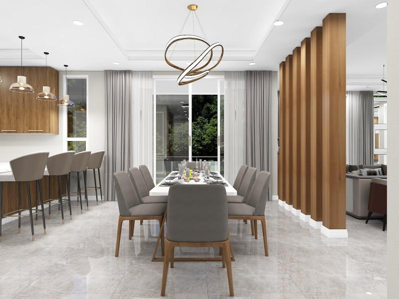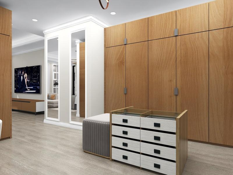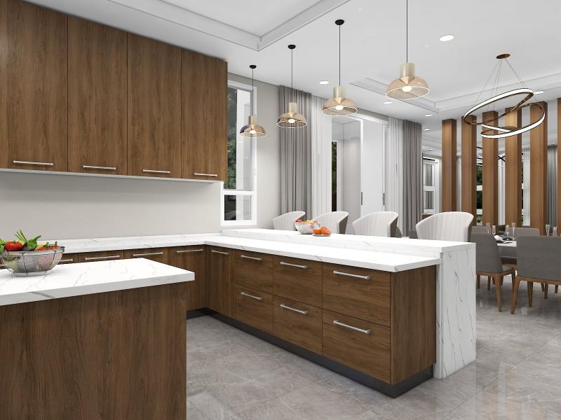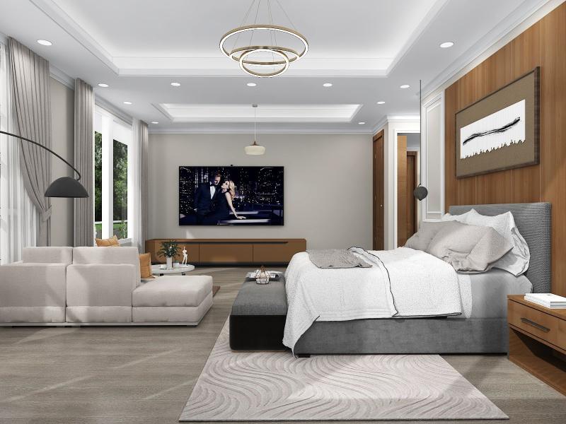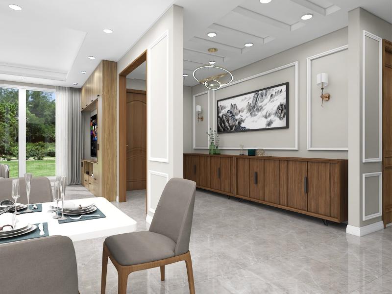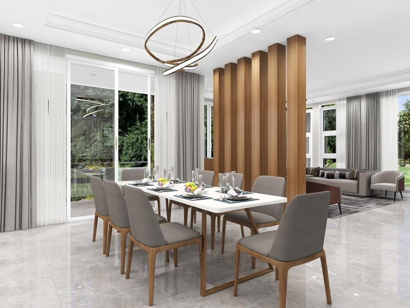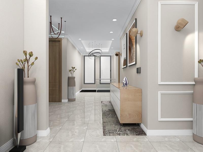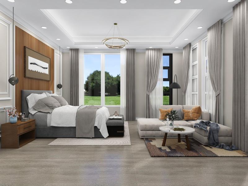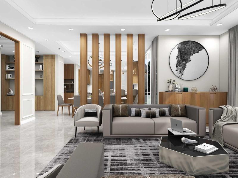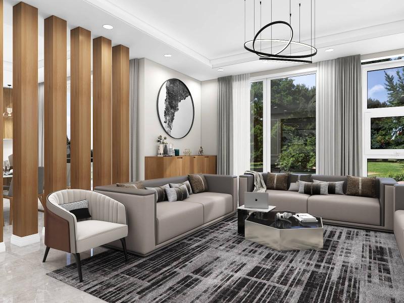 Neutral color floor tiles with all wooden furniture make the design modern and sophisticated.