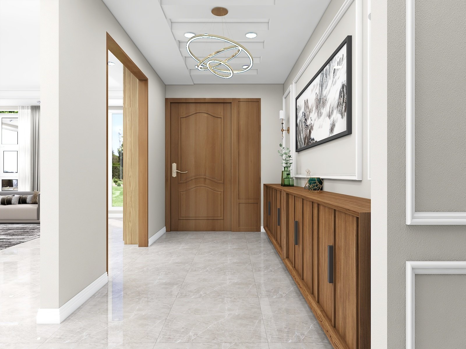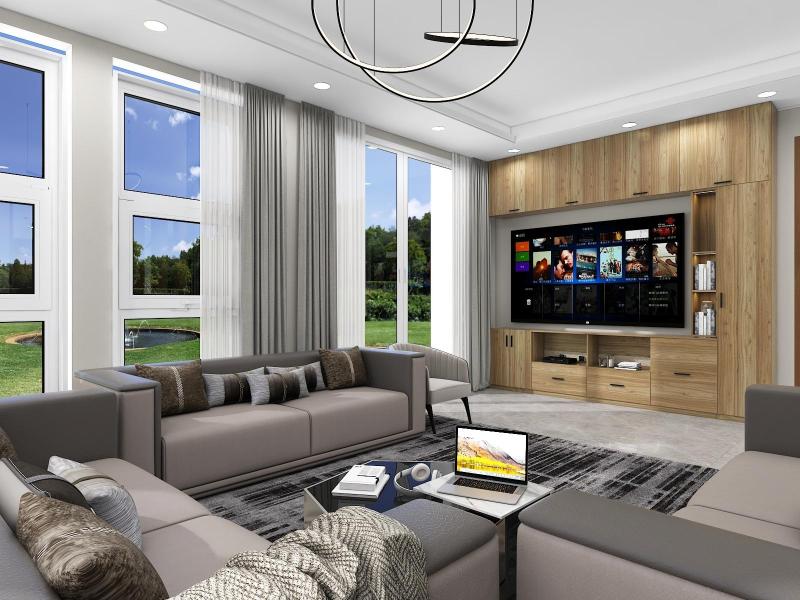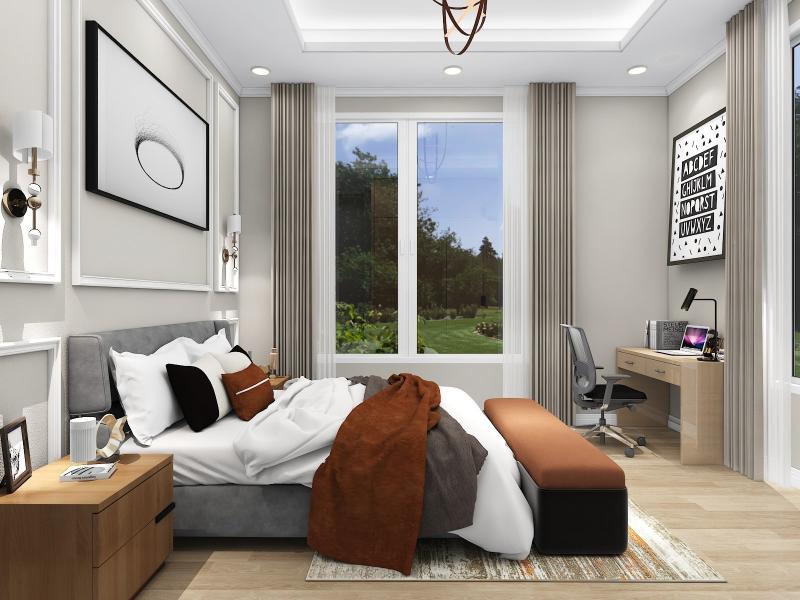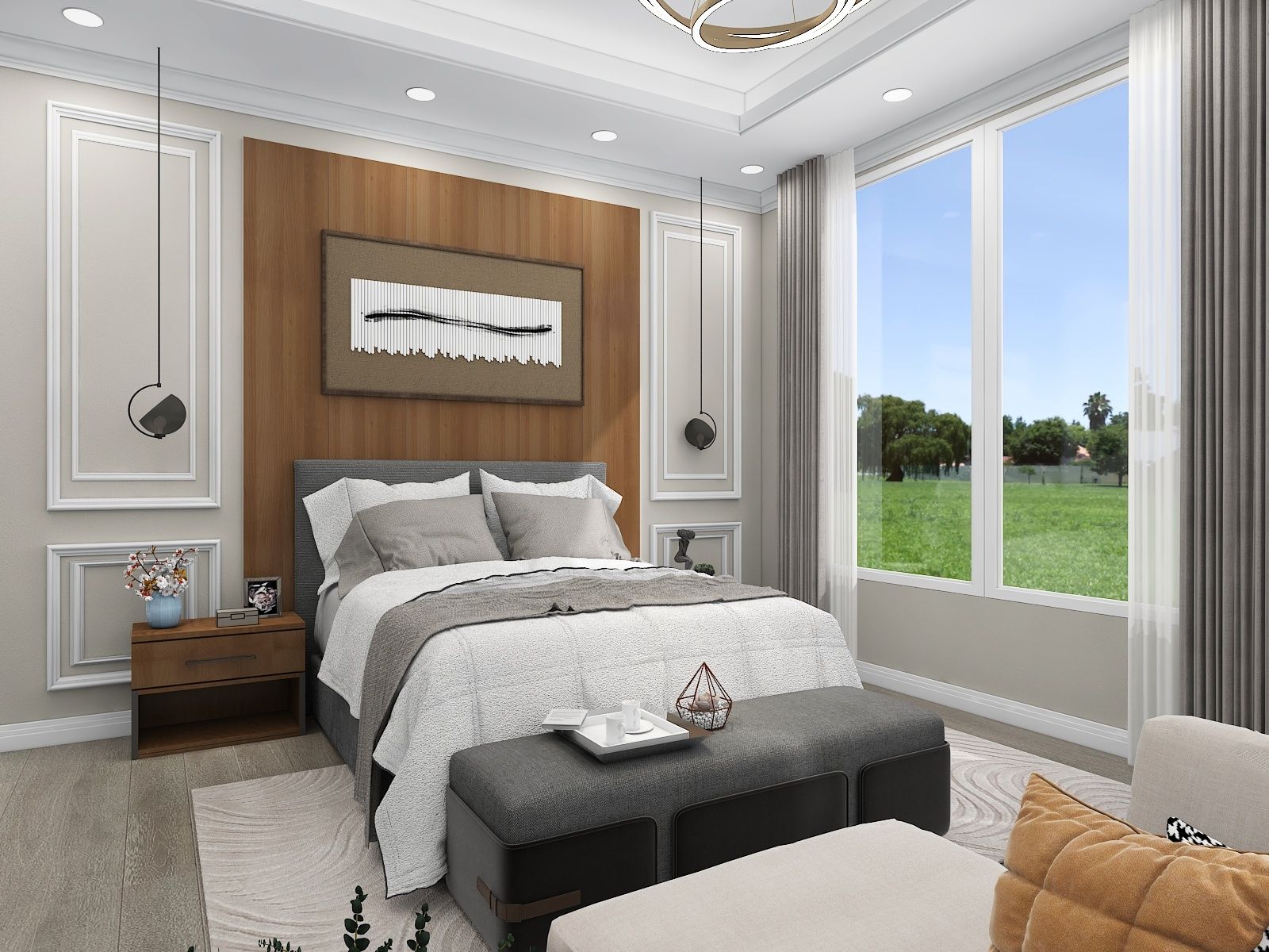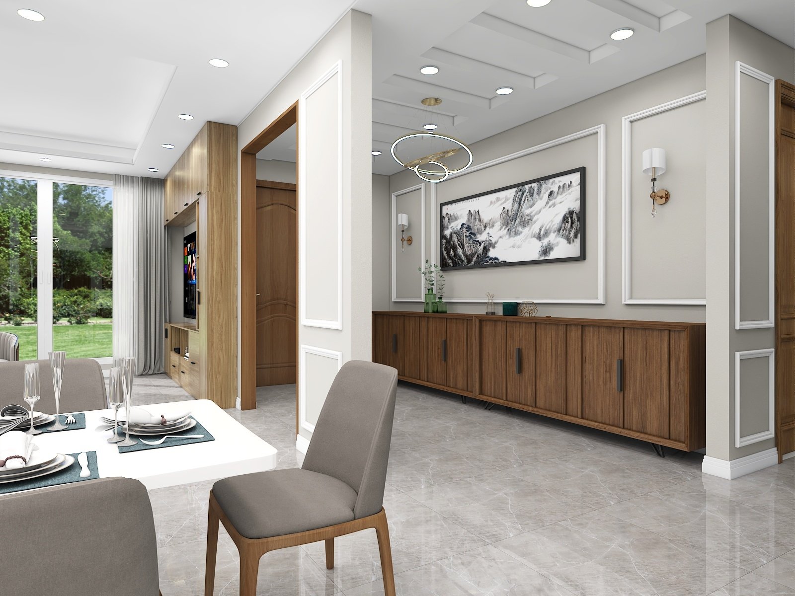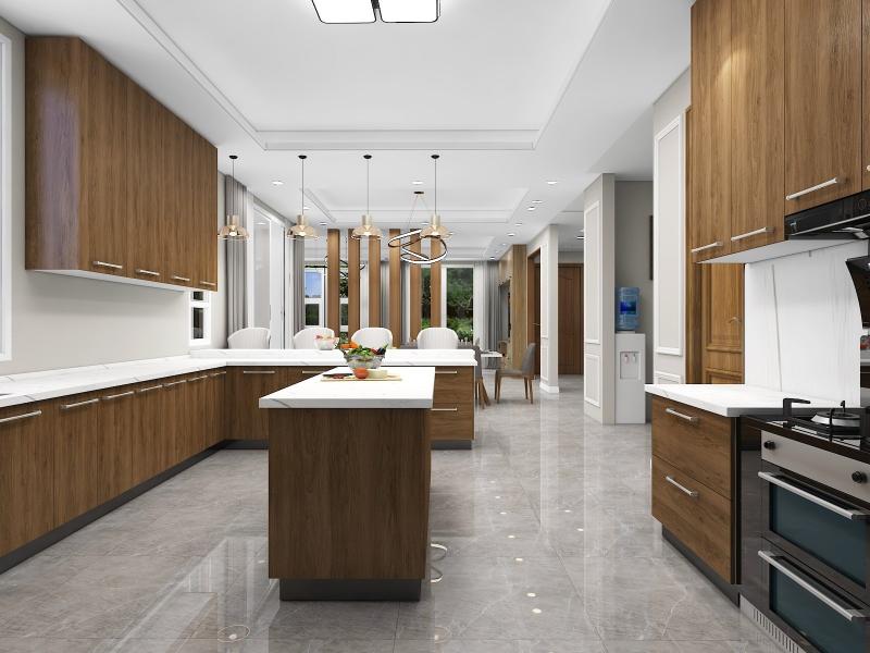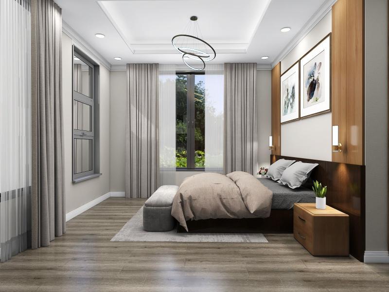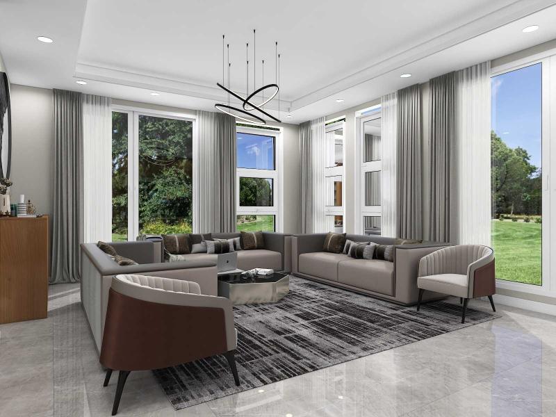Neutral color floor tiles with all wooden furniture make the design modern and sophisticated.