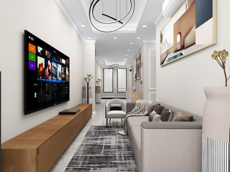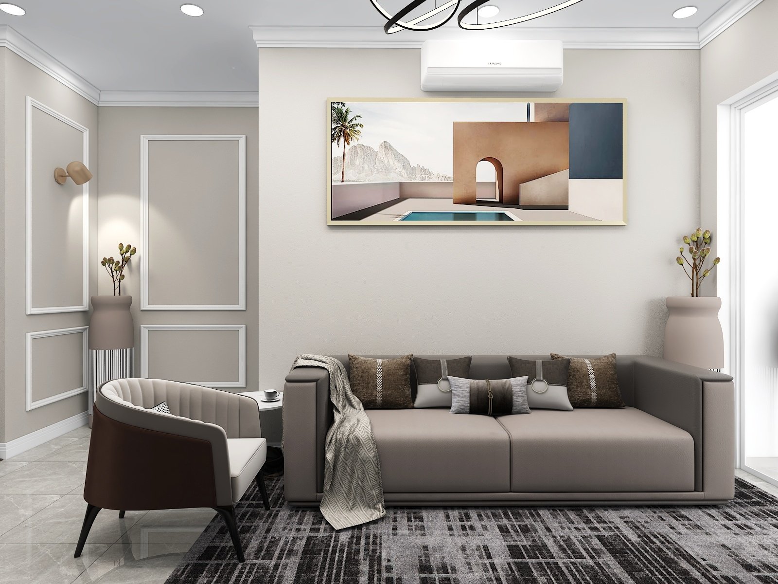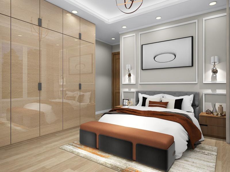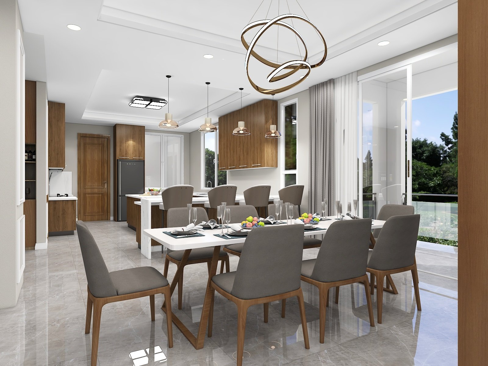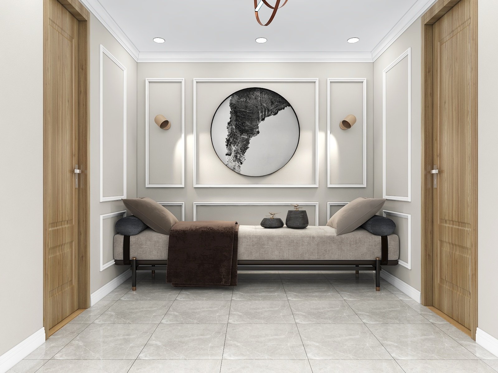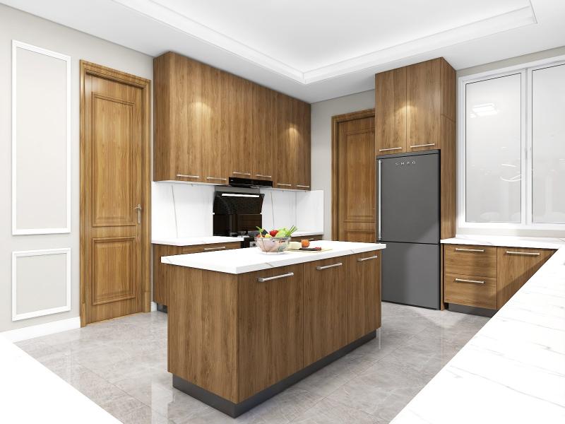 Neutral color floor tiles with all wooden furniture make the design modern and sophisticated.