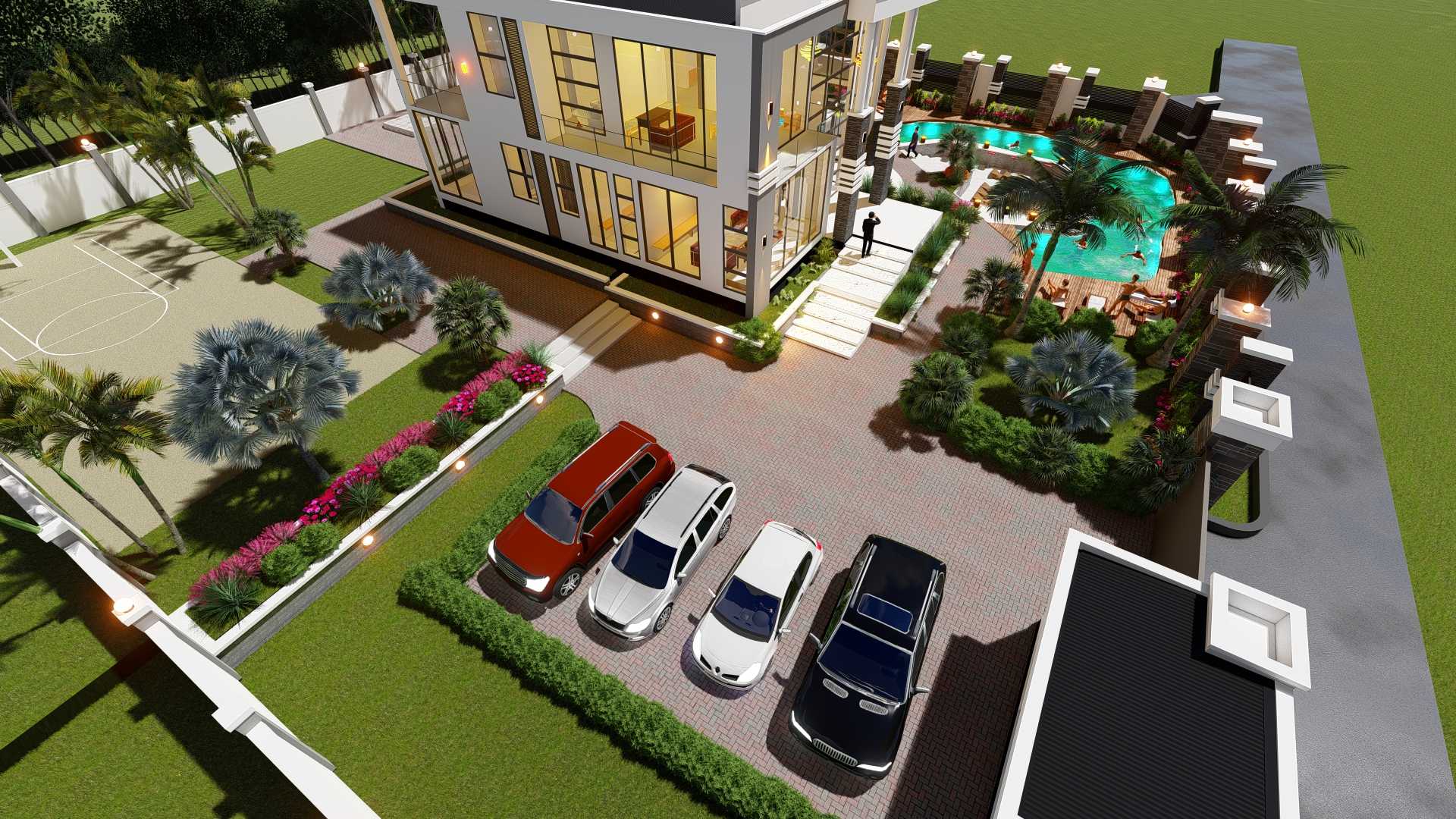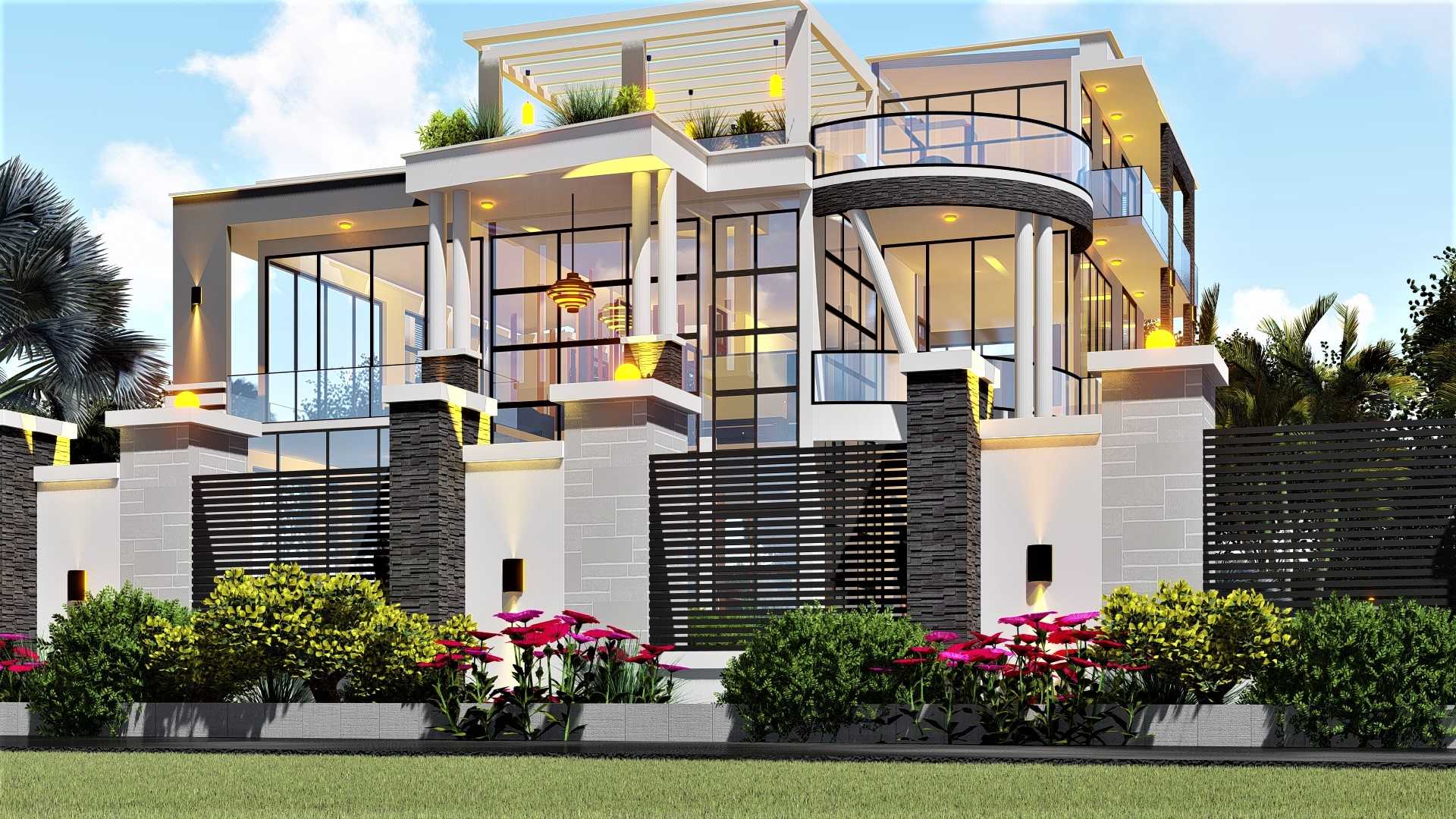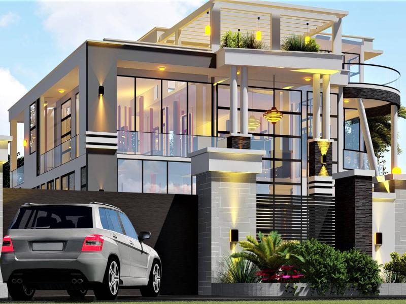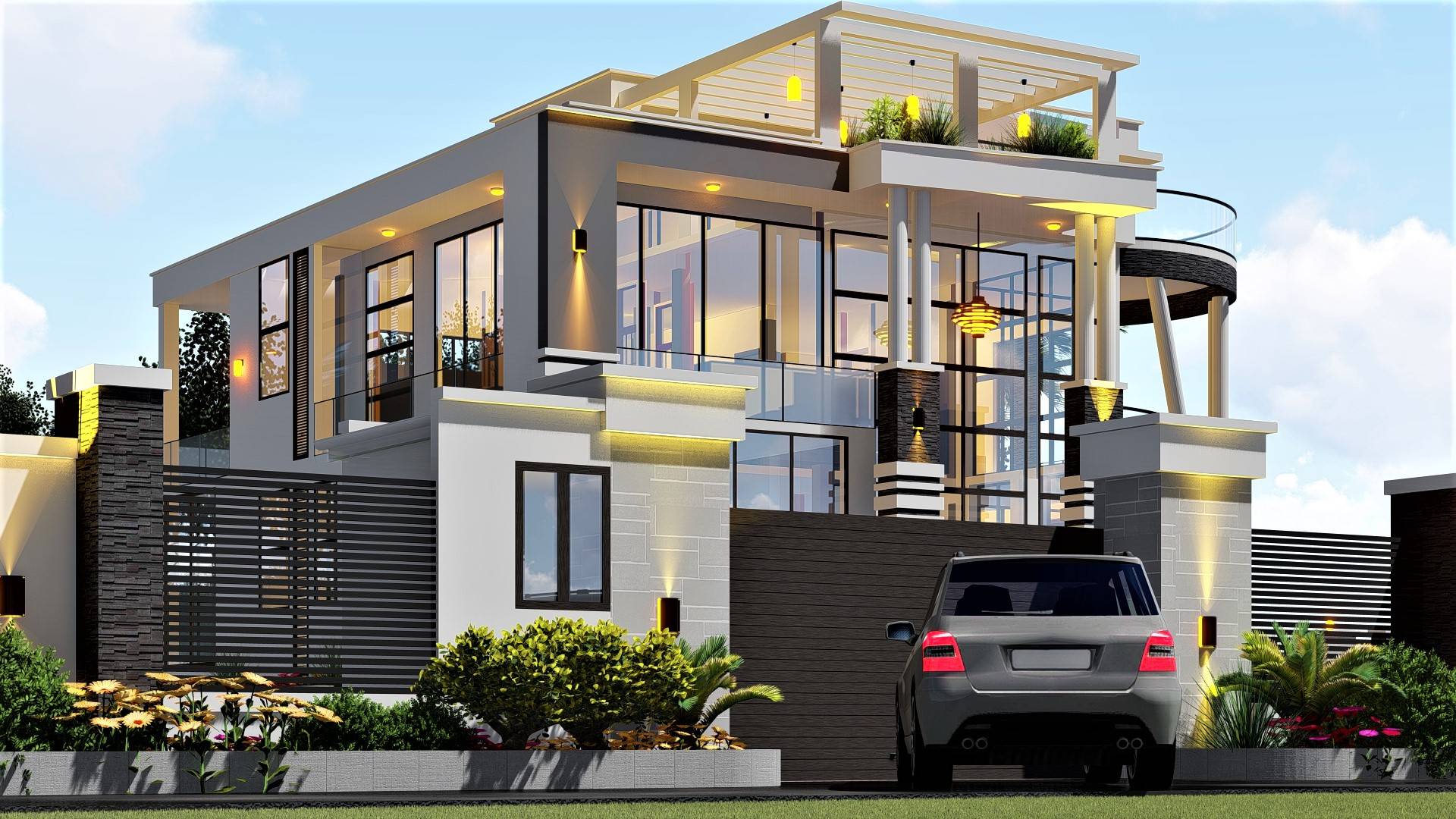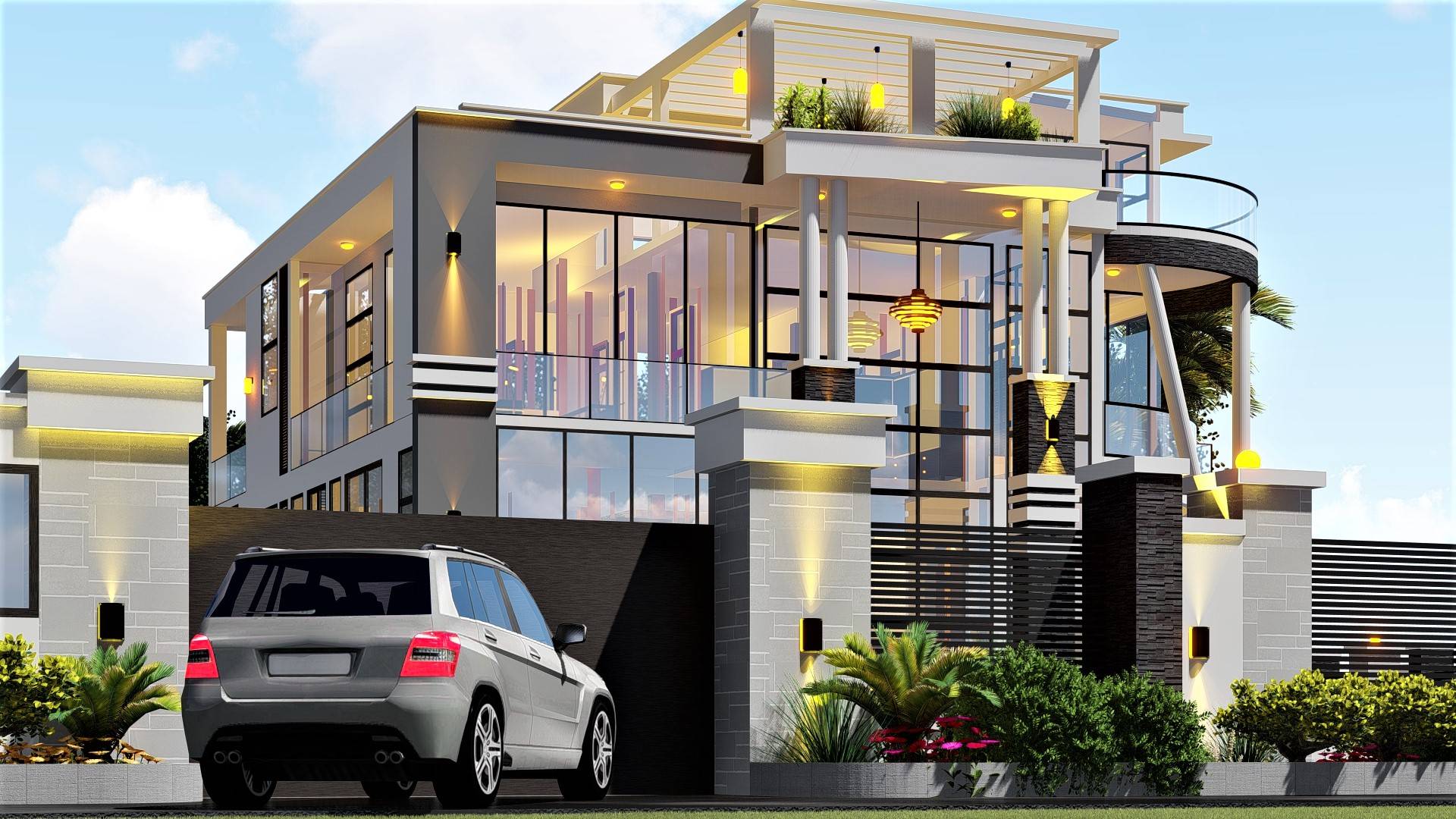 A Modern contemporary house design where glass take dominance externally which makes the whole design stand out. The uniqueness on this design is the giantism of columns to the entry and the slanting column.