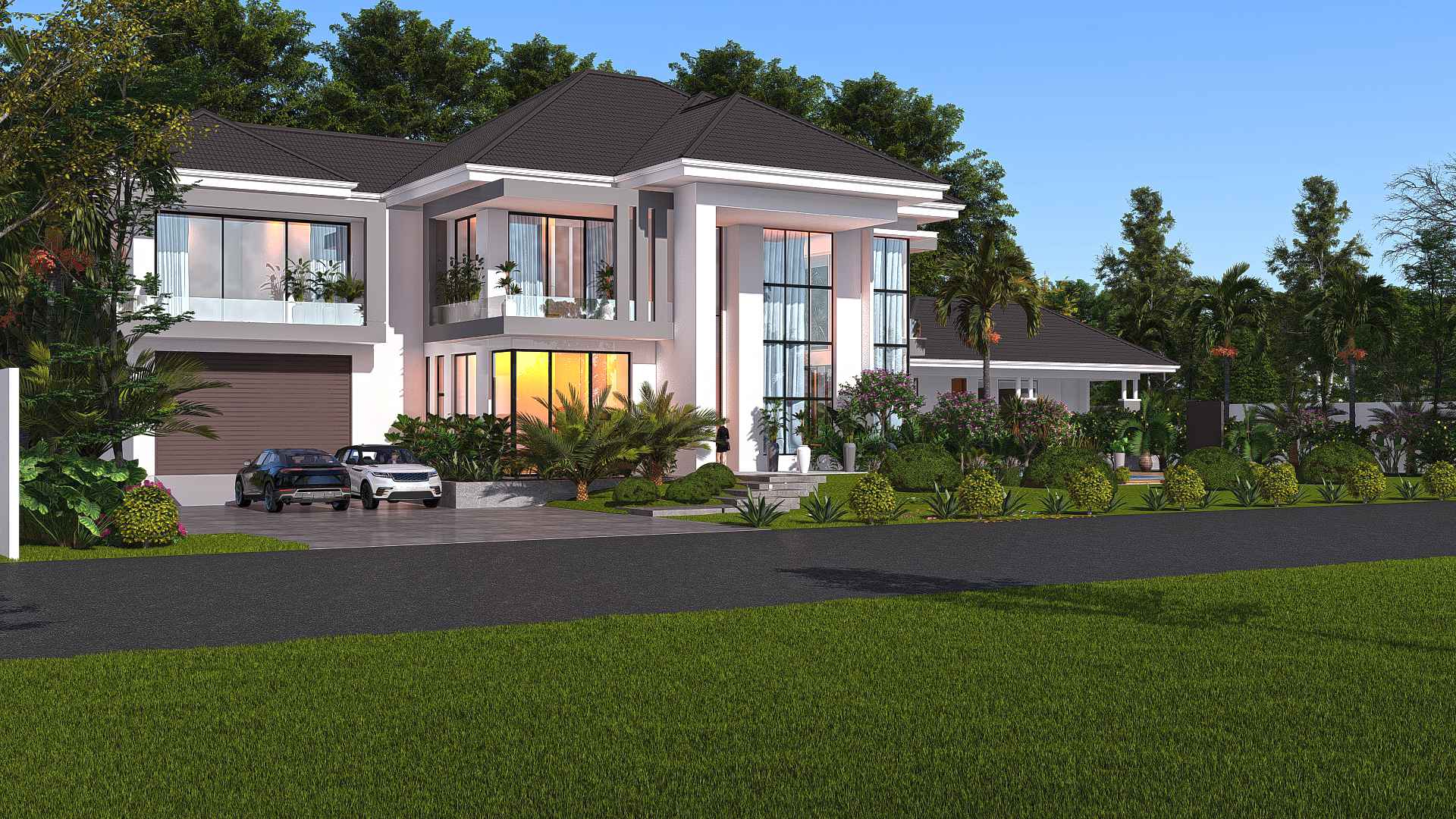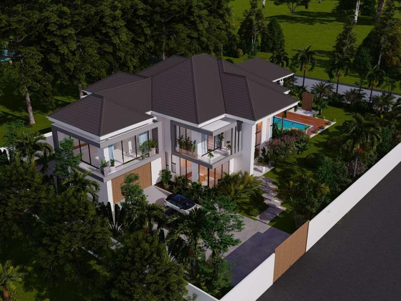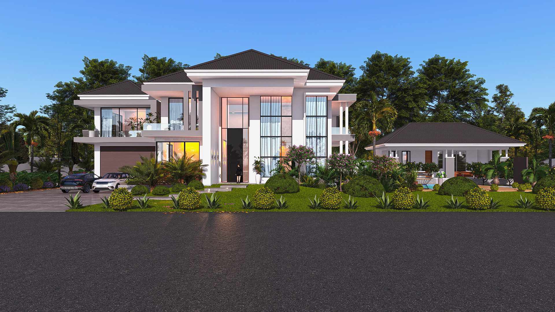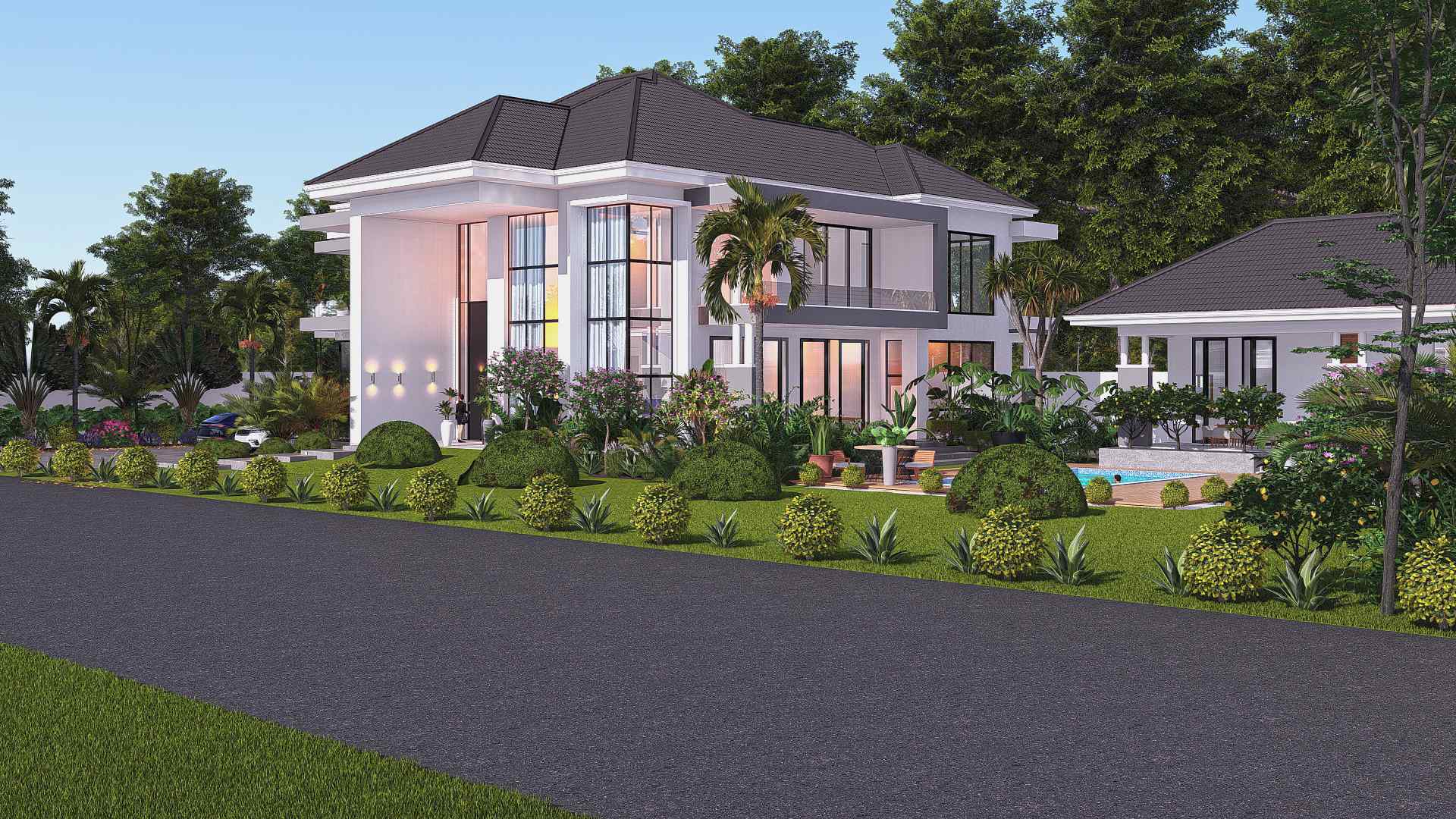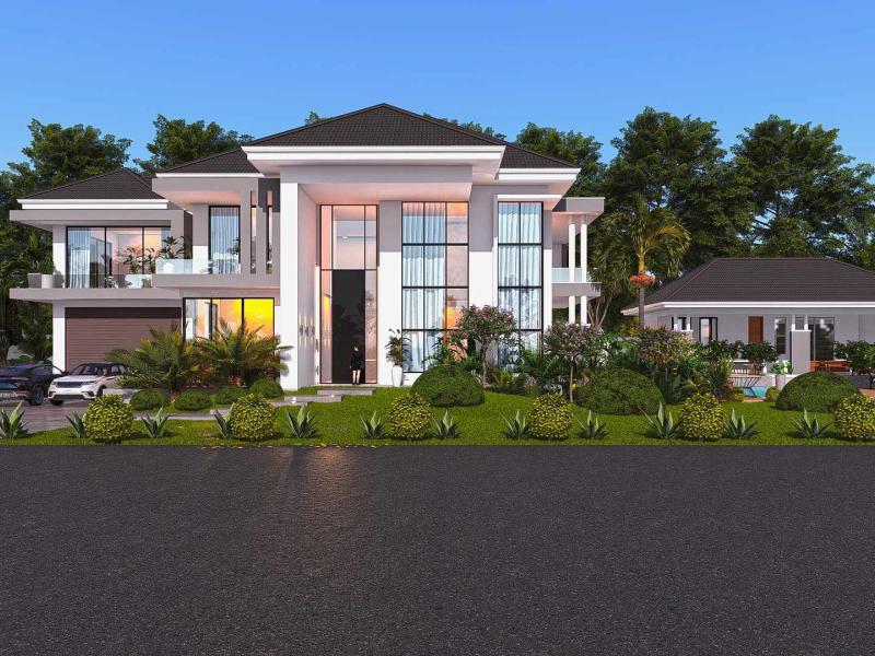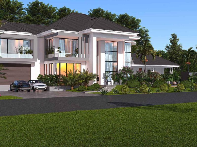 A unique double height lounge with a large glass facade windows around to add the beauty to this 5bedrooms and 4bathrooms residential house.